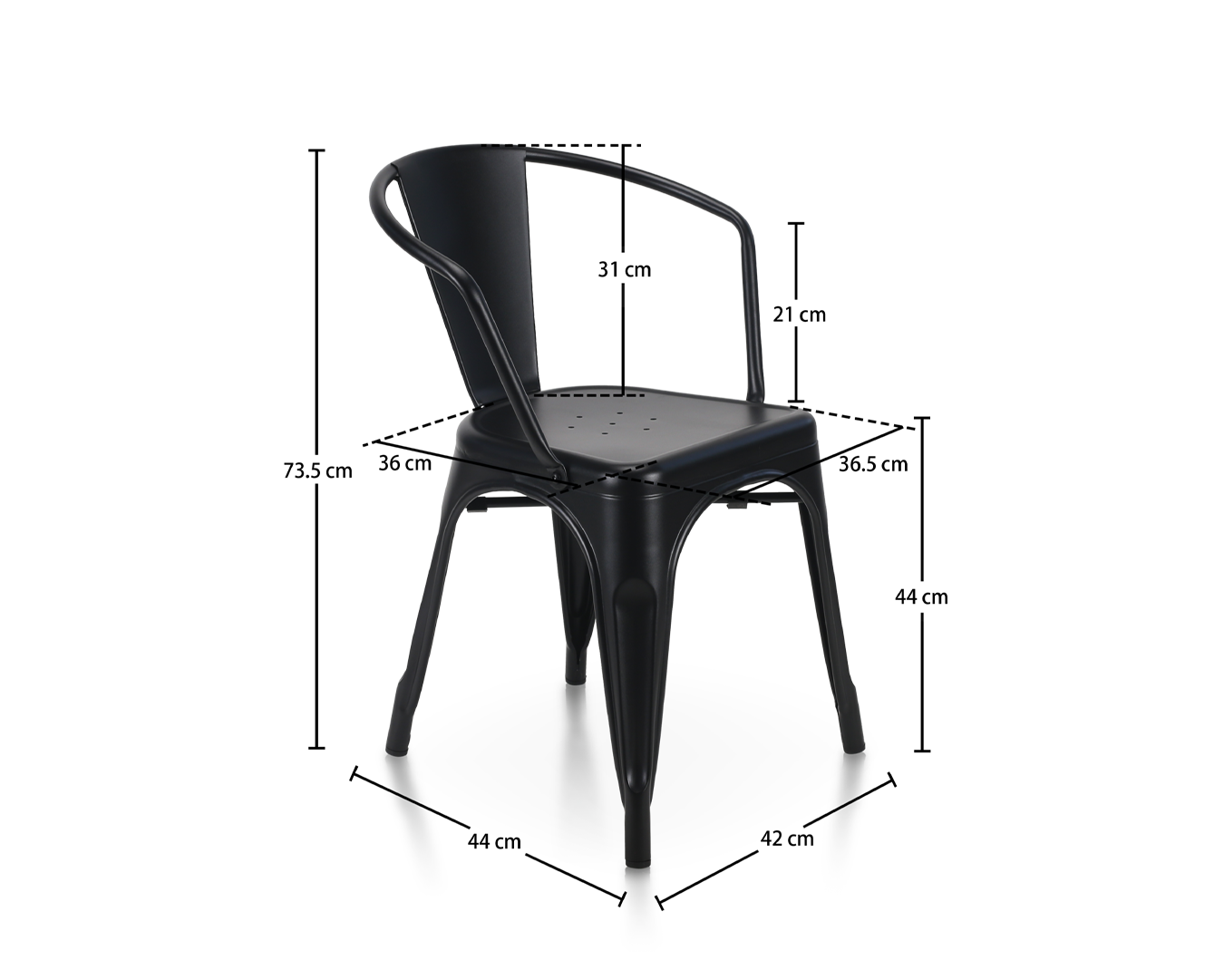 • Tato židle je mistrovským dílem průmyslového designu, vytvořeného z vysoce kvalitního železa a dokončeného v elegantní černé barvě, která vyzařuje eleganci. Pozornost k detailům v jeho konstrukci je patrná ve všech aspektech, od přesného svařování po hladké obrysy rámu.