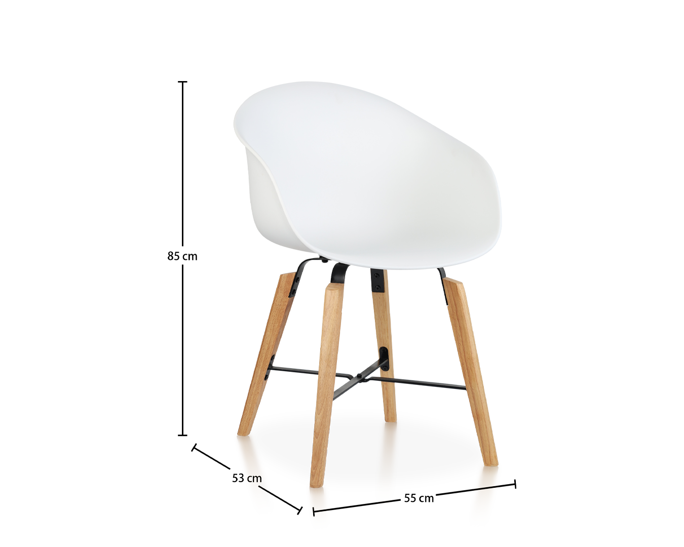 • Sedadlo, které je vytvořeno z formovaného polypropylenu, je odolné a snadno se čistí. Gumové dřevěné nohy a černé práškové konektory potažené práškem přidávají teplo a kontrastují k celému bílému vzhledu.