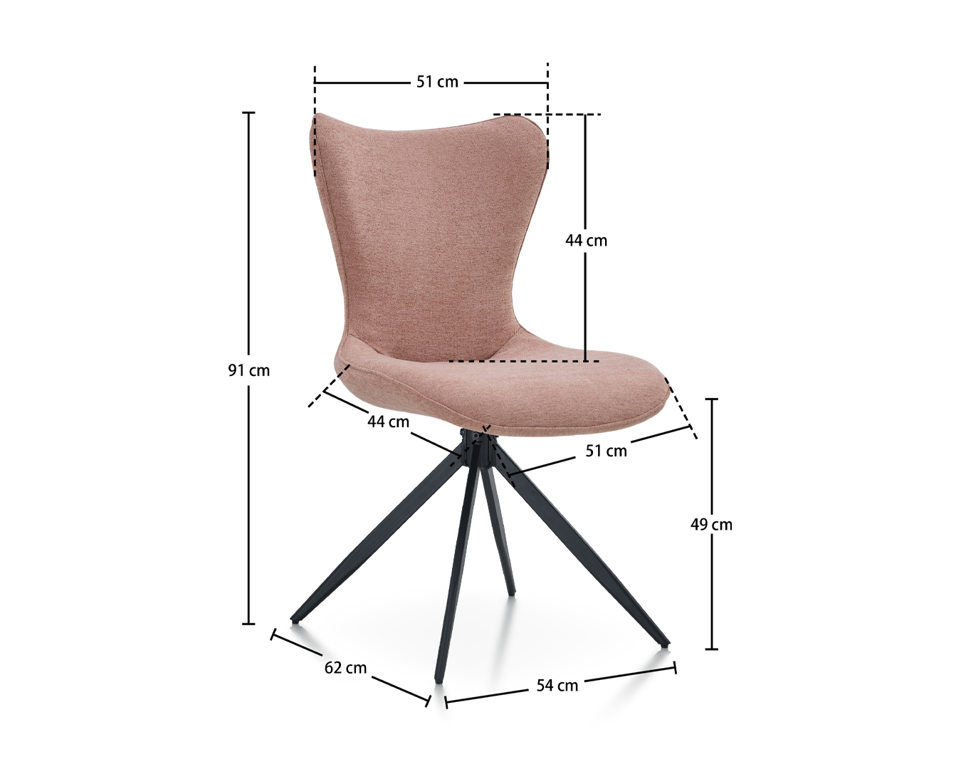 • Čalounění v měkké, červenavé růžové látce nabízí útulný zážitek z sezení a přidává do jakéhokoli jídelního prostoru nádech sofistikovanosti. Elegantní design židle je doplněn jeho robustní základnou černého kovu, která nejen poskytuje stabilitu, ale také zvyšuje jeho současnou přitažlivost.
