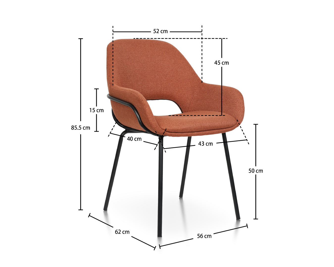 • Tato židle s výraznou kovovou základnou a krásnou směsí měkké látky nabízí stylový vkus a zároveň poskytuje optimální pohodlí pro dlouhé uvolněné večeře. Ergonomický design a výška sedadla 50 cm vytvářejí ideální jídelní zážitek, zatímco robustní rám zajišťuje trvalou trvanlivost.