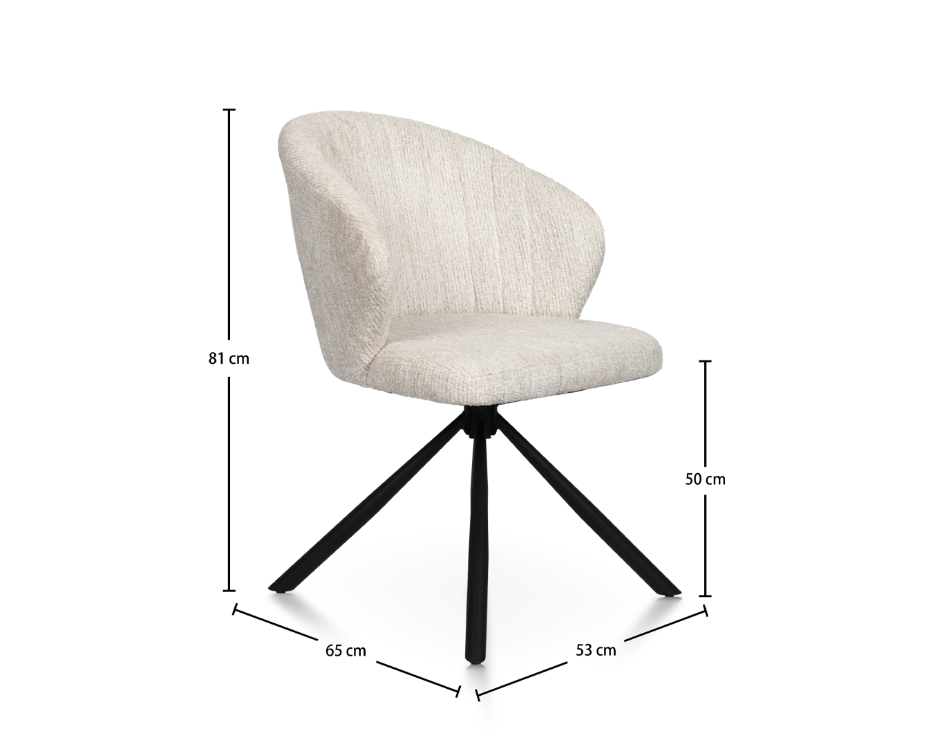 • Navrženo se zaměřením na estetiku i ergonomii, může se může pochlubit krémovým čalouněním, které přidává do jakékoli místnosti nádech sofistikovanosti. Zakřivený opěradlo židle a dostatek sedací plochy poskytují výjimečné pohodlí, zatímco jeho černé kovové nohy nabízejí robustní podporu a moderní vkus.